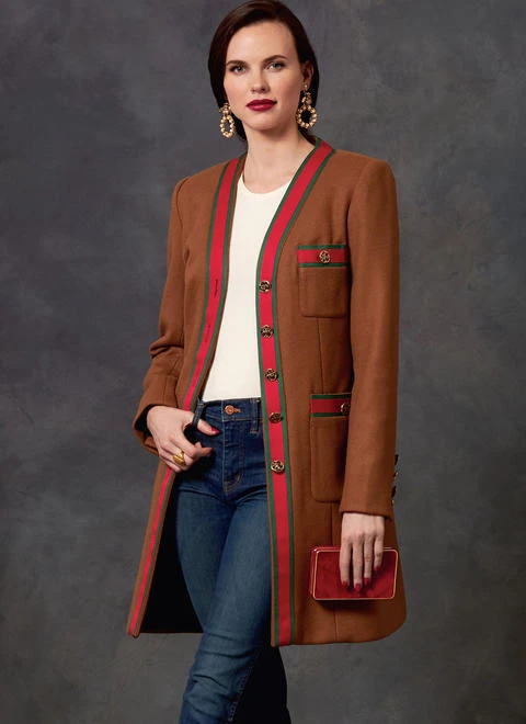 - A, B:Semi-fitted, buttoned jacket is lined and has patch pockets, ribbon details and length variations.