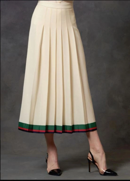 - D:Pleated skirt has center back invisible zipper, waistband with button closure and ribbon detail.