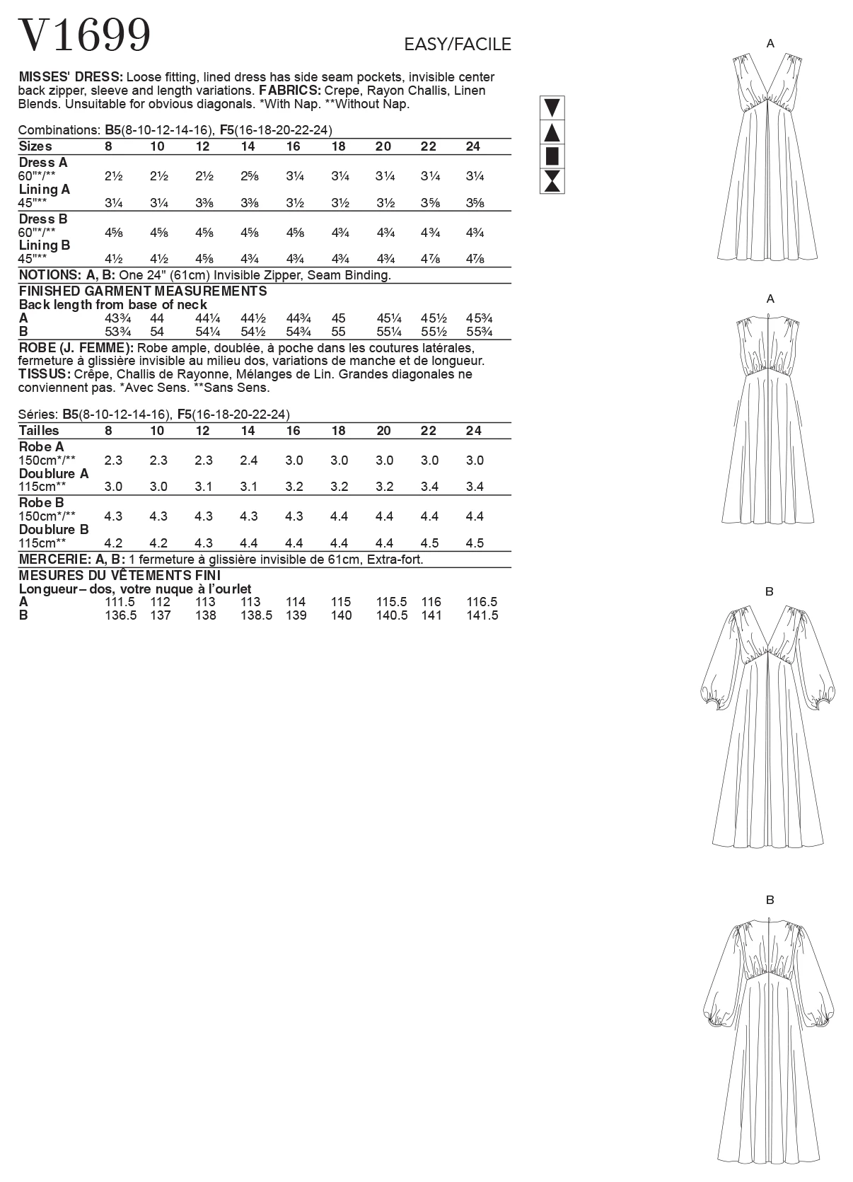 | Loose fitting, lined dress has side seam pockets, invisible center back zipper, sleeve and length variations. |