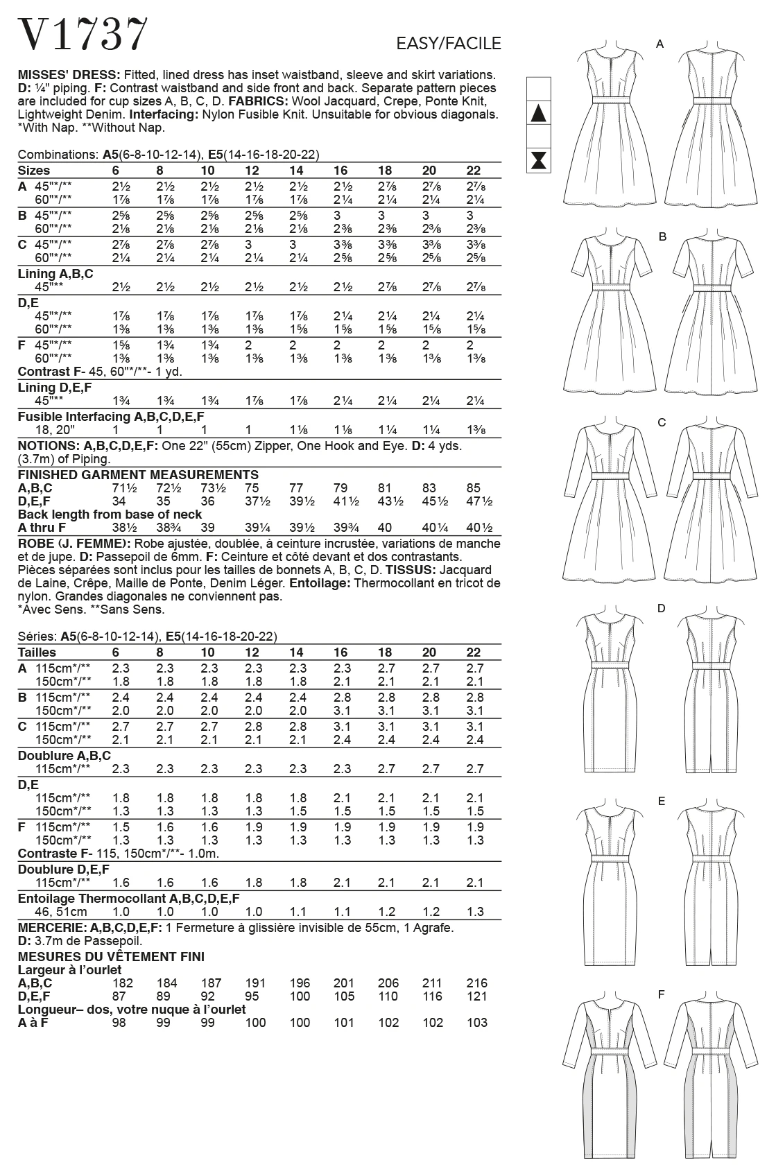 Fitted, lined dress has inset waistband, sleeve and skirt variations. D: 1/4″ piping. F: Contrast waistband and side front and back. Includes separate pieces for A, B, C and D cup sizes.