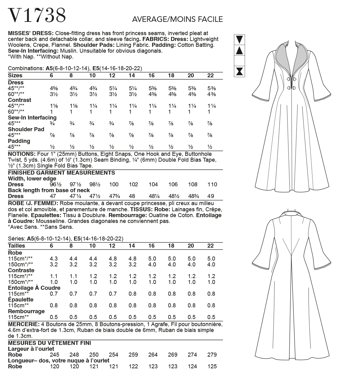 Close fitting dress has front princess seams, inverted pleat at center back and detachable collar and sleeve facing.