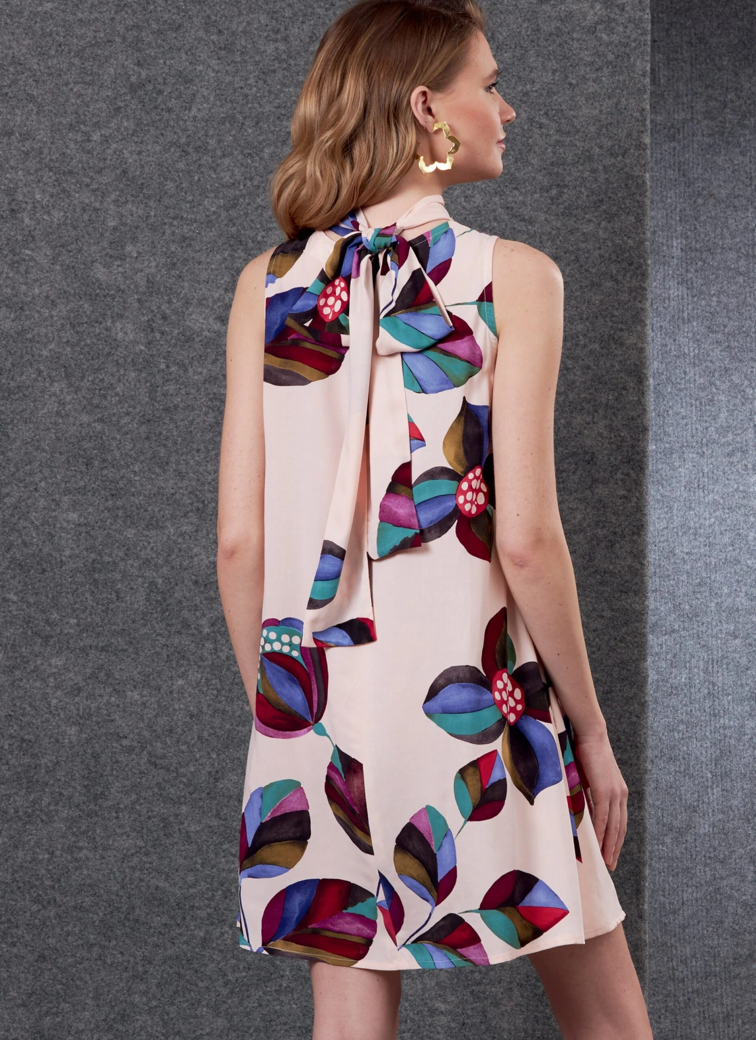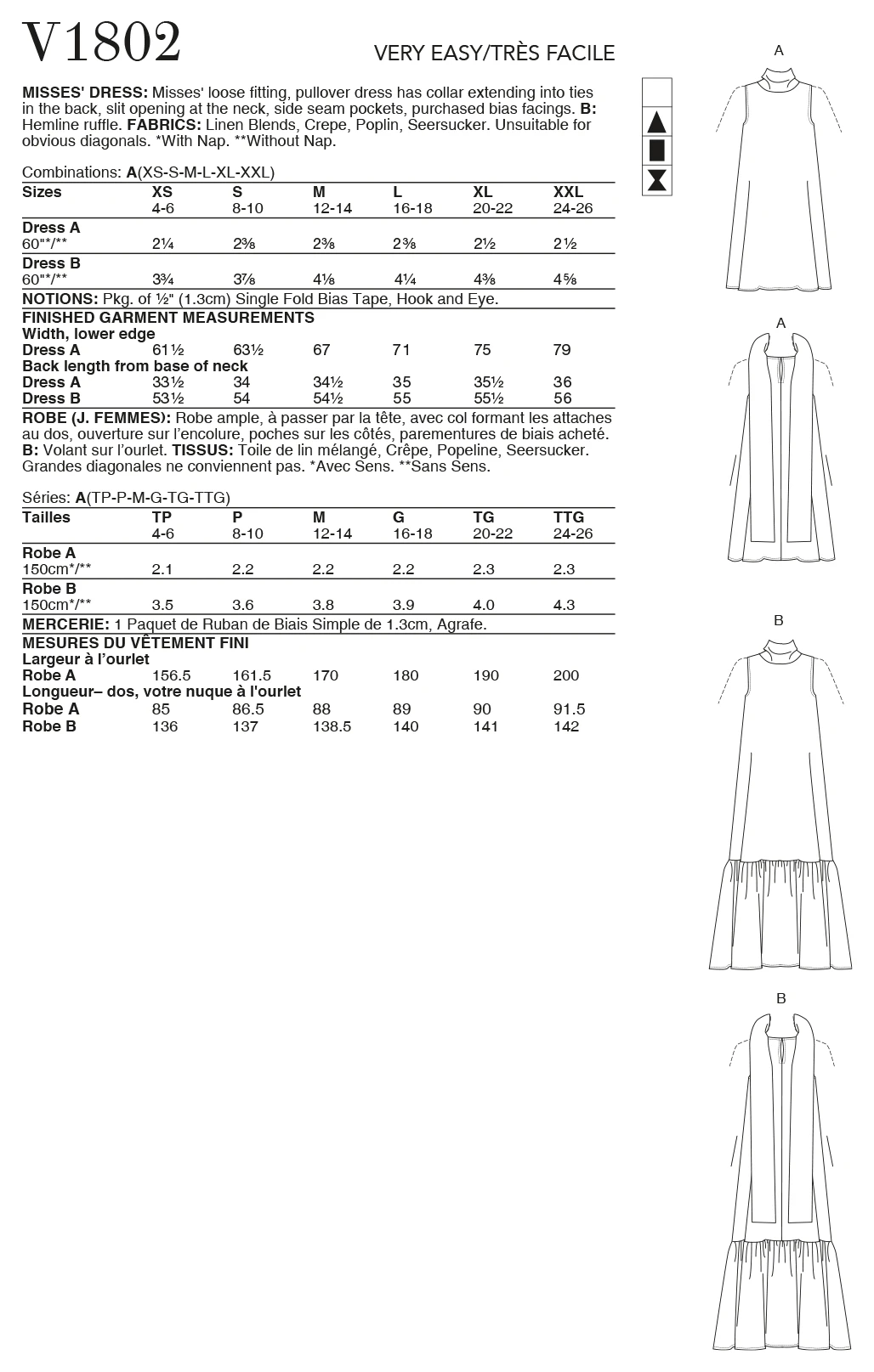 Misses’ loose fitting, pullover dress has collar extending into ties in the back, slit opening at the neck, side seam pockets, purchased bias facings. B: hemline ruffle.