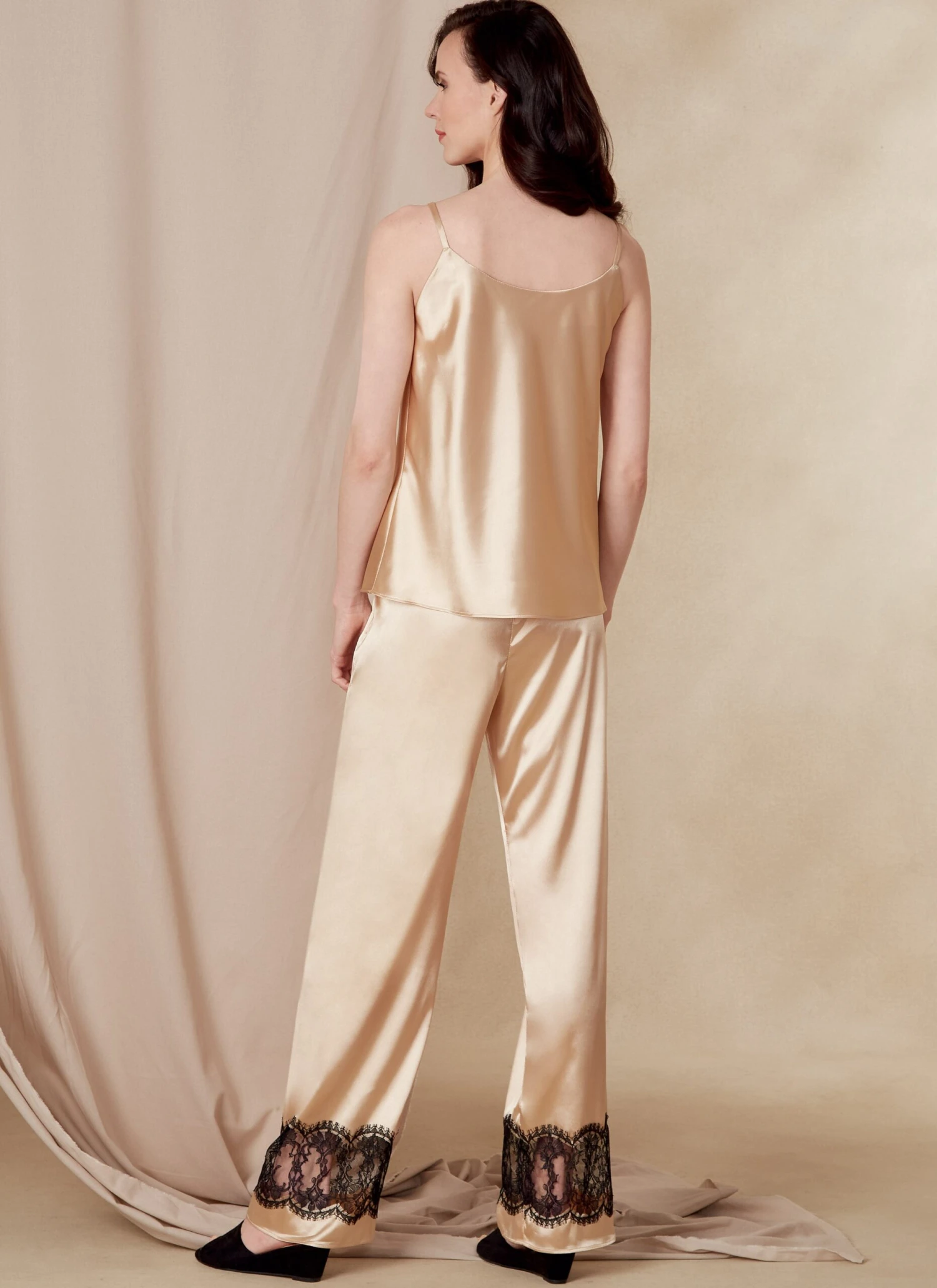 Misses’ and misses’ petite loose-fitting wrap robe has raglan sleeves, side seam pockets, shaped neckband, belt, self loops. Camisole and slip have narrow shoulder straps, neck and armhole facings, lace trim. Close-fitting, elastic waist bias cut shorts. Semi-fitted, elastic waist pants. A, B, C, D, E: applied purchased trim.