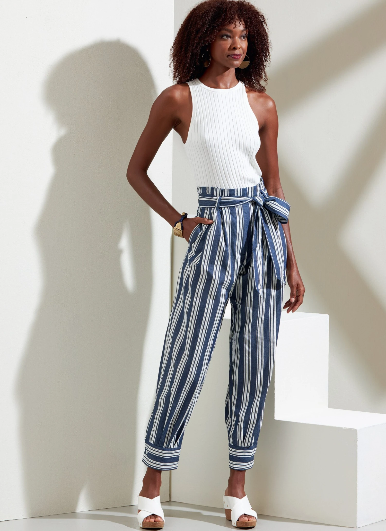 Paperbag waist pants, semi-fitted through hip, have front pleats, side seam pockets, matching tie belt and fly zipper. View A is above ankle length and has button cuffs with side seam opening. View B is full length and has stitched hems.