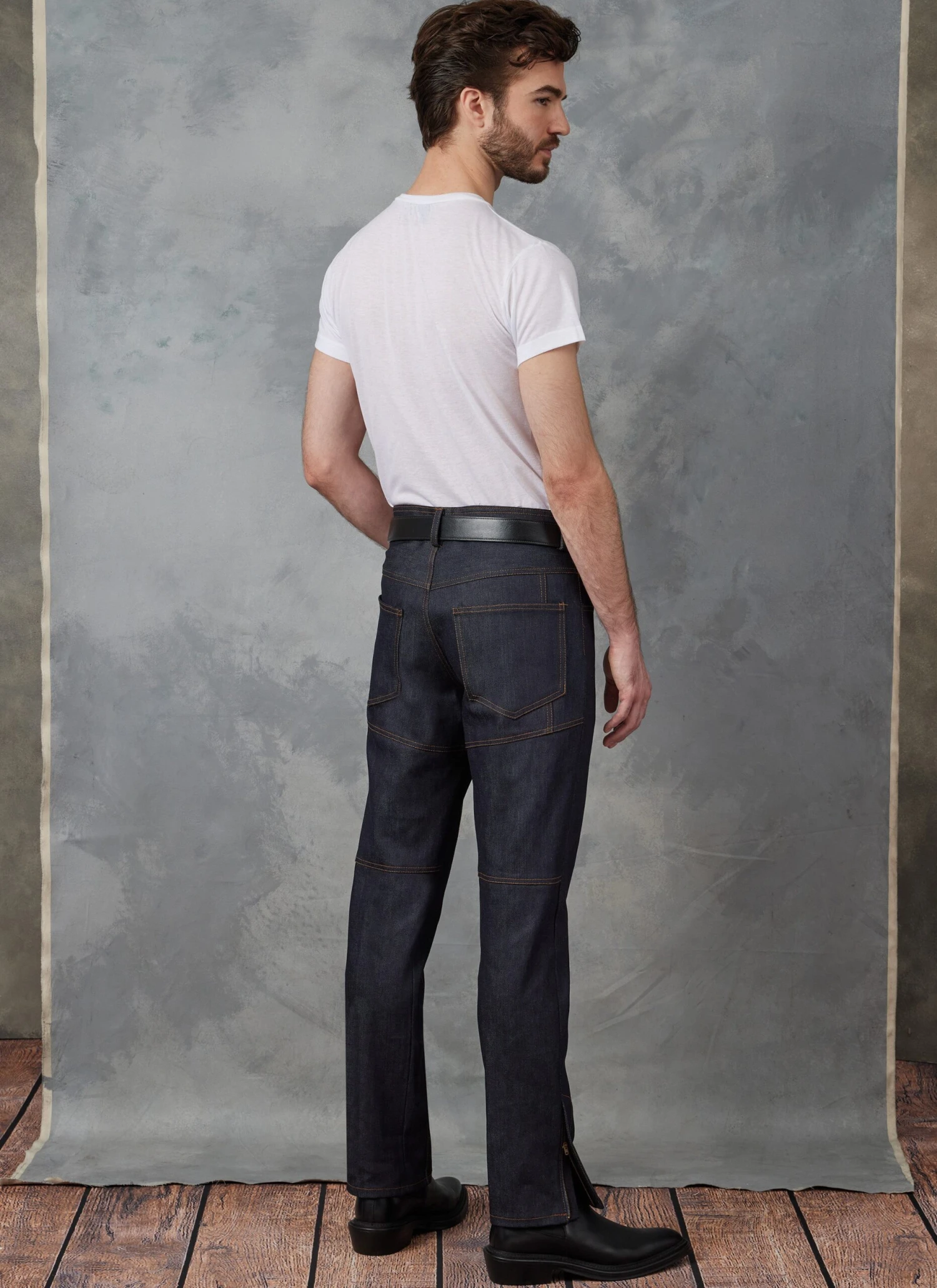 Men’s close-fitting, tapered leg jeans have fly zipper closing, waistband with belt carriers, back yoke, back patch pockets, front pockets, coin pocket, edgestitching and topstitching, front and back seaming for a perfect fit, narrow hems, and ankle zip vents.