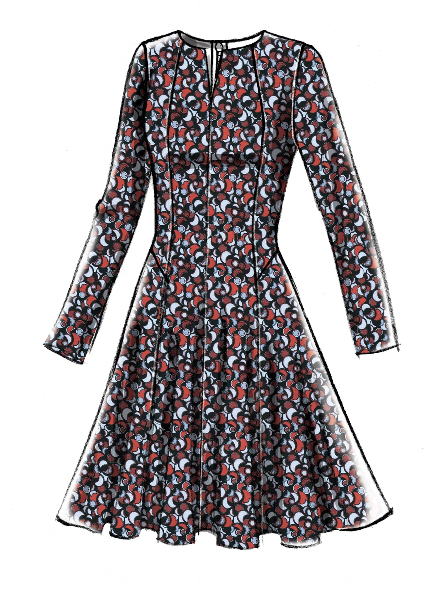 Lined dress (close-fitting through bust) has seam detail and back zipper. A, B and C:semi-fitted through hips and back slit. C and E:two-piece sleeves.