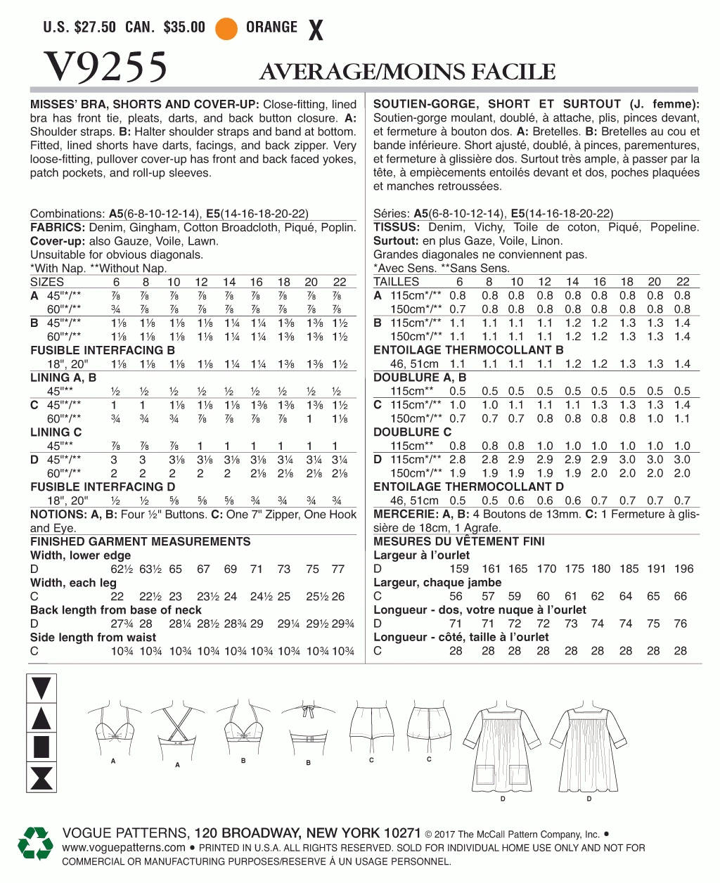 Vogue Pattern V9255 Misses’ Lined Halter Bra And Shorts, And Square-Neck Coverup With Pockets