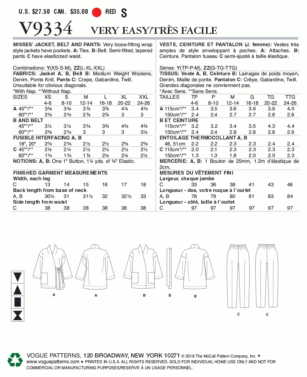 Vogue Pattern V9334 Misses’ Jacket, Belt And Pants